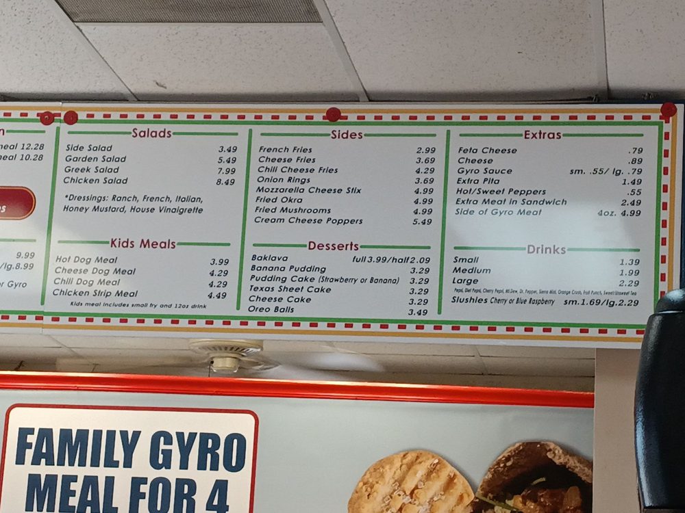 Topped with gyro meat, grilled onions, pickles, ketchup, mustard, and gyro sauce on the side.