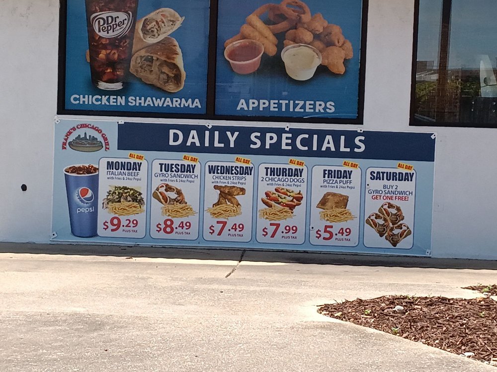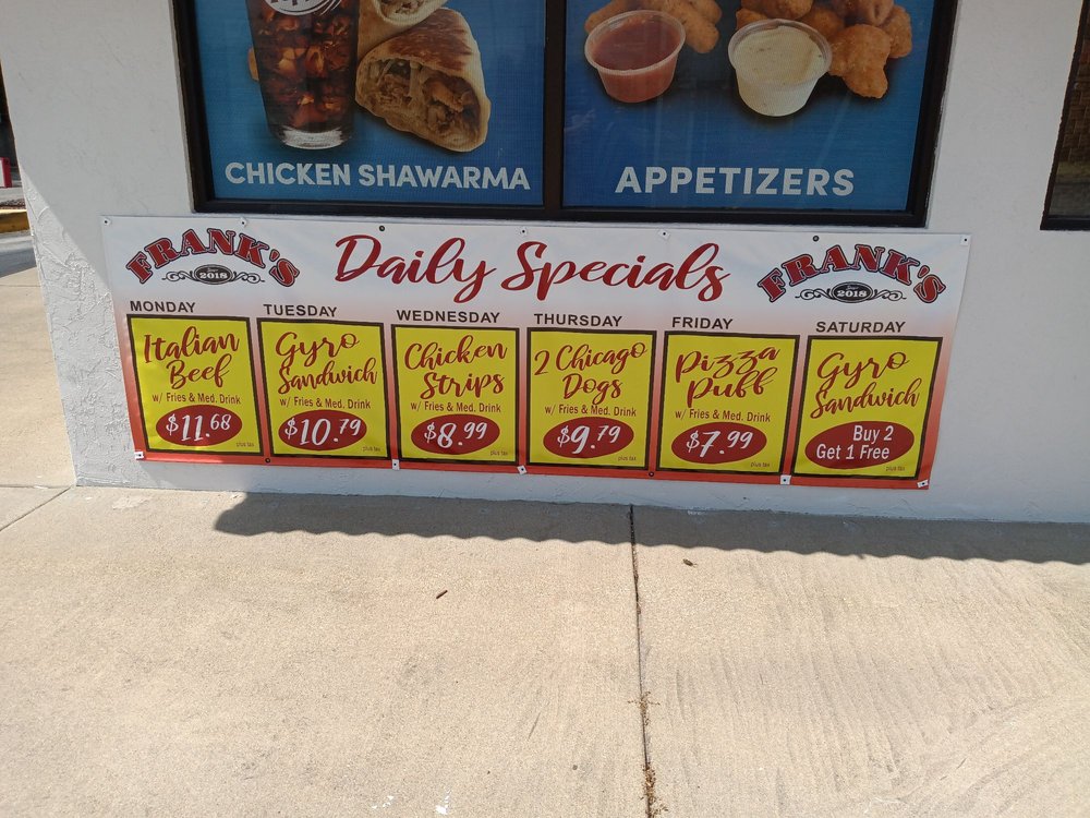 Diners can also enjoy hearty burgers, like the Gyro Burger, complemented by grilled onions and gyro sauce. With options for outdoor seating and group-friendly facilities, Frank's is an ideal spot for both quick bites and leisurely meals. Customers rave about the fresh ingredients and friendly service, making every visit feel special. Whether you're a local or just passing through, Frank's promises a delightful culinary experience!
